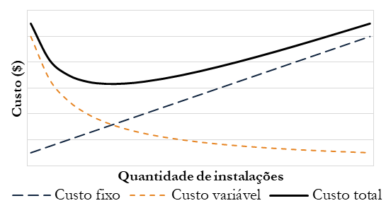A ideia básica do desenho de malha convencional é equilibrar os custos de transporte e os custos fixos de instalação, para obter a quantidade ideal de instalações, como podemos ver na Figura 4.