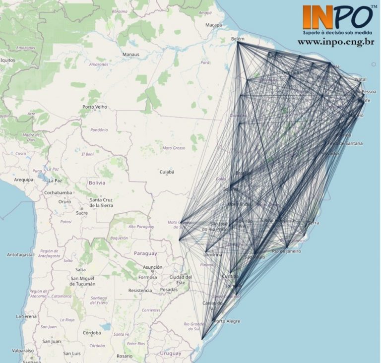 Já a demanda de um problema de HUB equivalente, com os mesmos 42 pontos, pode ter mais de 1.700 demandas de transporte diferentes (representadas pelas linhas do mapa à direita).