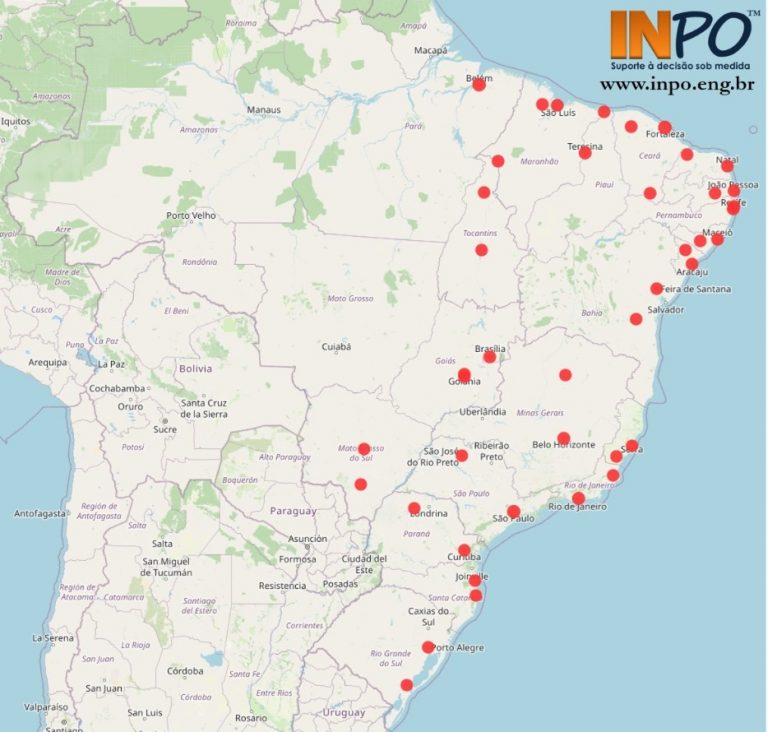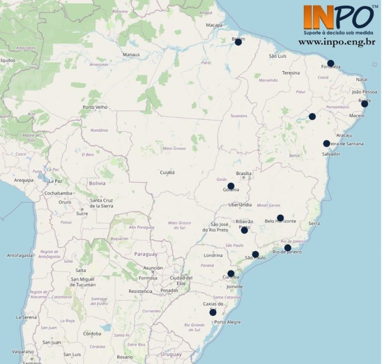 Para ambos os problemas, é fundamental definir um conjunto de candidatos a instalações logísticas. Nesse sentido, esses candidatos podem ser centros de distribuição ou, alternativamente, HUBs de consolidação. Neste exemplo, utilizei o mesmo conjunto de candidatos, composto por doze das principais cidades com demanda, conforme ilustrado na Figura 3.