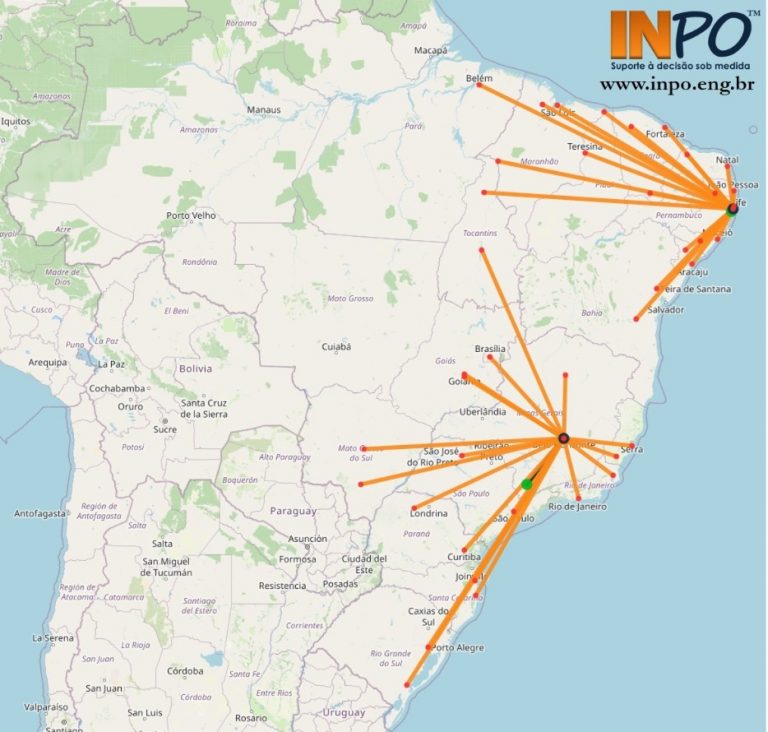 Além disso, a localização de cada instalação, estrategicamente posicionada em relação à demanda e aos fornecedores (Figura 5) permite minimizar as distâncias de transporte, e por consequência, seus custos. Repare que nesse tipo de solução, toda a rede logística não está necessariamente conectada, uma vez que é possível descentralizar a produção e o estoque de mercadorias.