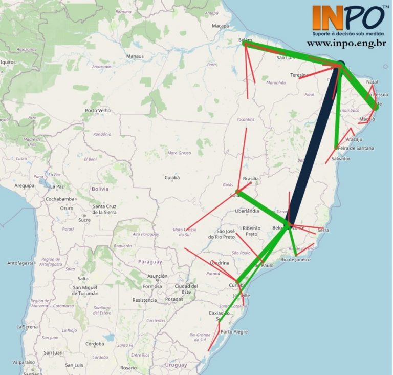 Os fluxos de transporte entre os HUBs (linha azul da Figura 6) normalmente ocorrem com veículos maiores, como carretas. Esses veículos apresentam ganhos de escala. Quanto maior o veículo utilizado, menor é o custo unitário de transporte. Nesse tipo de problema, a necessidade de transporte já está associada à demanda e por isso toda a rede de transporte é necessariamente interconectada.