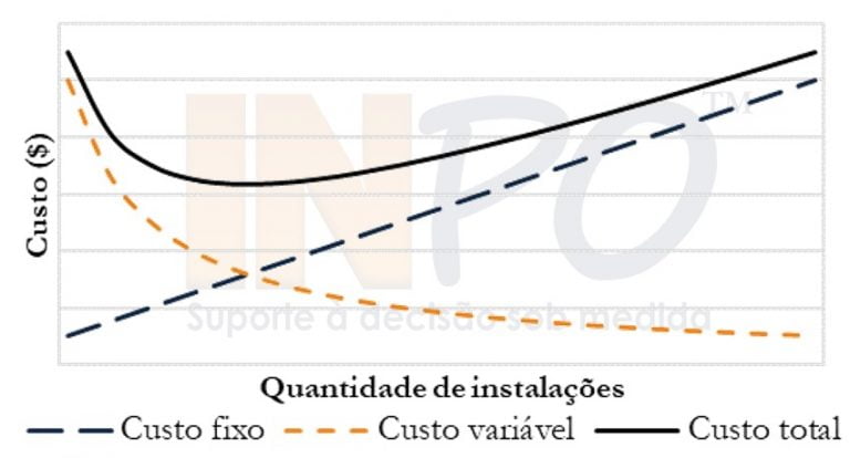 A Figura 1 retrata o comportamento dos custos quando a quantidade de instalações varia. Quanto maior a quantidade de centros de distribuição existentes, maior é o custo fixo da operação. Por outro lado, mais instalações podem permitir que as distâncias das viagens de abastecimento e distribuição sejam menores e que o custo total de transporte seja reduzido.